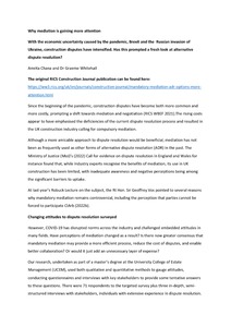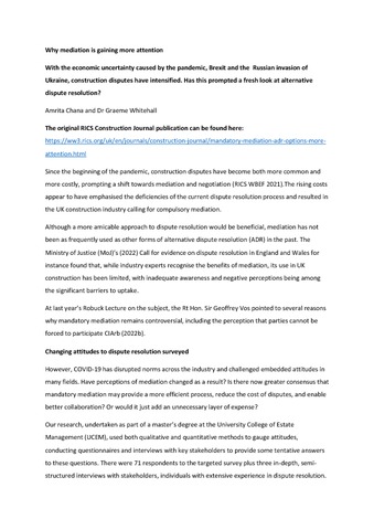 Chana, Amrita and Whitehall, Graeme (2023) Why mediation is gaining more attention With the economic uncertainty caused by the pandemic, Brexit and the Russian invasion of Ukraine, construction disputes have intensified. Has this prompted a fresh look at alternative dispute resolution? MODUS RICS Construction Journal. (In Press)