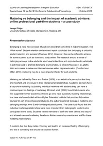 Belonging is not a new concept: it has been around for some time in higher education. The ‘What works? Student retention and success’ report concluded that ‘belonging is critical to student retention and success’ (Thomas, 2012). However, this can be difficult to achieve for some students such as those who study online. The research around a sense of belonging amongst online students, who have limited time and opportunities to participate in activities used to promote belonging at universities, is limited (Peacock et al., 2020). With an increase in online and blended courses within higher education (Dumford and Miller, 2018), mattering may be a more important factor for such students. Mattering as defined by Dixon and Tucker (2008), is an individual’s perception that they are important and are valued in their interpersonal relationships. Academic advisors have a key role in mattering: by building individual relations with students they can have a positive impact on feelings of mattering. McIntosh et al. (2020) found that students who feel supported by their academic advisors go on to have successful tutoring relationships. In a case study conducted within a Higher Education Institute that provides fully online courses for part-time professional students, the author examined feelings of mattering and belonging amongst level 5 and 6 undergraduate students. The case study found that the individual mattering relationships were more important than belonging to students who participated in the study. Students valued members of staff who went ‘above and beyond’ and showed care and mattering. Academic Advisors were key members of staff for these mattering relationships. If students feel that they matter, this may well lead to an increased feeling of belonging and this is something that should be explored further. Thijm Mattering vs belonging and